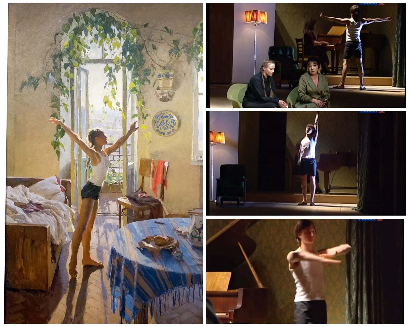 Заодно посчитаем и издевательски-смешную пародию на хрестоматийную картину Яблонской «Утро» в исполнении все того же Буланова, да-да, «гимназиста со школьным образованием».