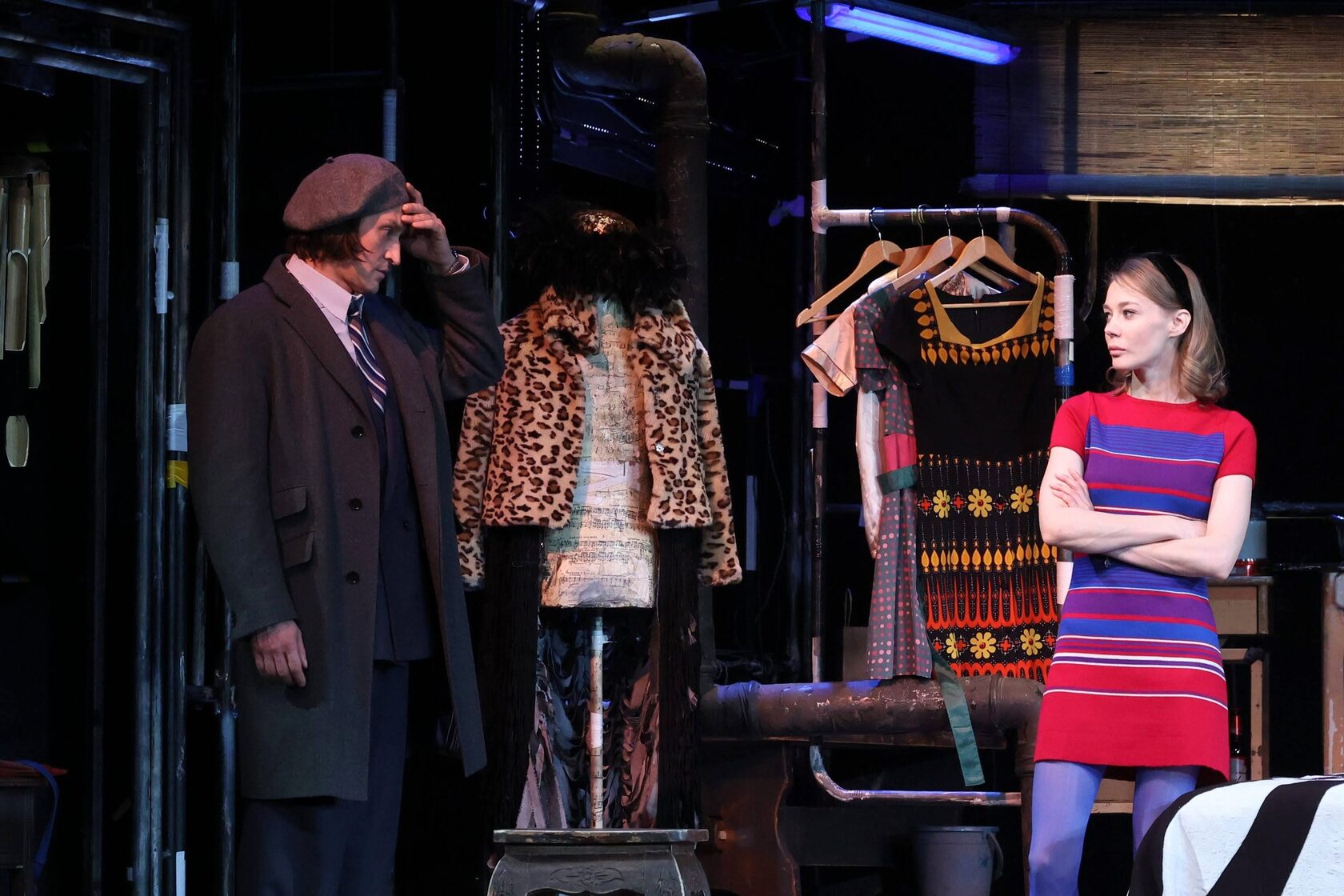 Опираясь опять же на разбор и на то, что из себя представляют «Двое на качелях», мы и с костюмами работали соответствующим образом. Первая постановка была в 1962 году. Сама пьеса написана в 1958-м, то есть удивительно, но спустя всего лишь четыре года Галина Борисовна уже имела перевод с американского и возможность постановки. Мы решили, что все действие необходимо перенести в актуальное время 1960-х. И в смысле костюмов мы все перенесли в 1960-е годы, и музыкальное оформление приблизили к 1960-м. У нас сложилась невероятная команда: Виктория Севрюкова откликнулась и согласилась поработать вместе с нами с костюмами, Павел Каплевич за всем этим следил — ведь он был художником- постановщиком спектакля. Дамир Исмагилов как художник по свету откликнулся на некоторые изменения в оформлении сцены. И вся техническая команда спектакля под чутким руководством Екатерины Ковыневой, заведующей художественно- постановочной частью, вместе с нами создавала новую редакцию. Я был счастлив поработать с этими профессионалами, потому что у всех горели глаза и все было сделано с большой любовью. Но, отвечая на ваш вопрос, своих вещей у меня, естественно, нет, потому что это все-таки 1960-е годы.